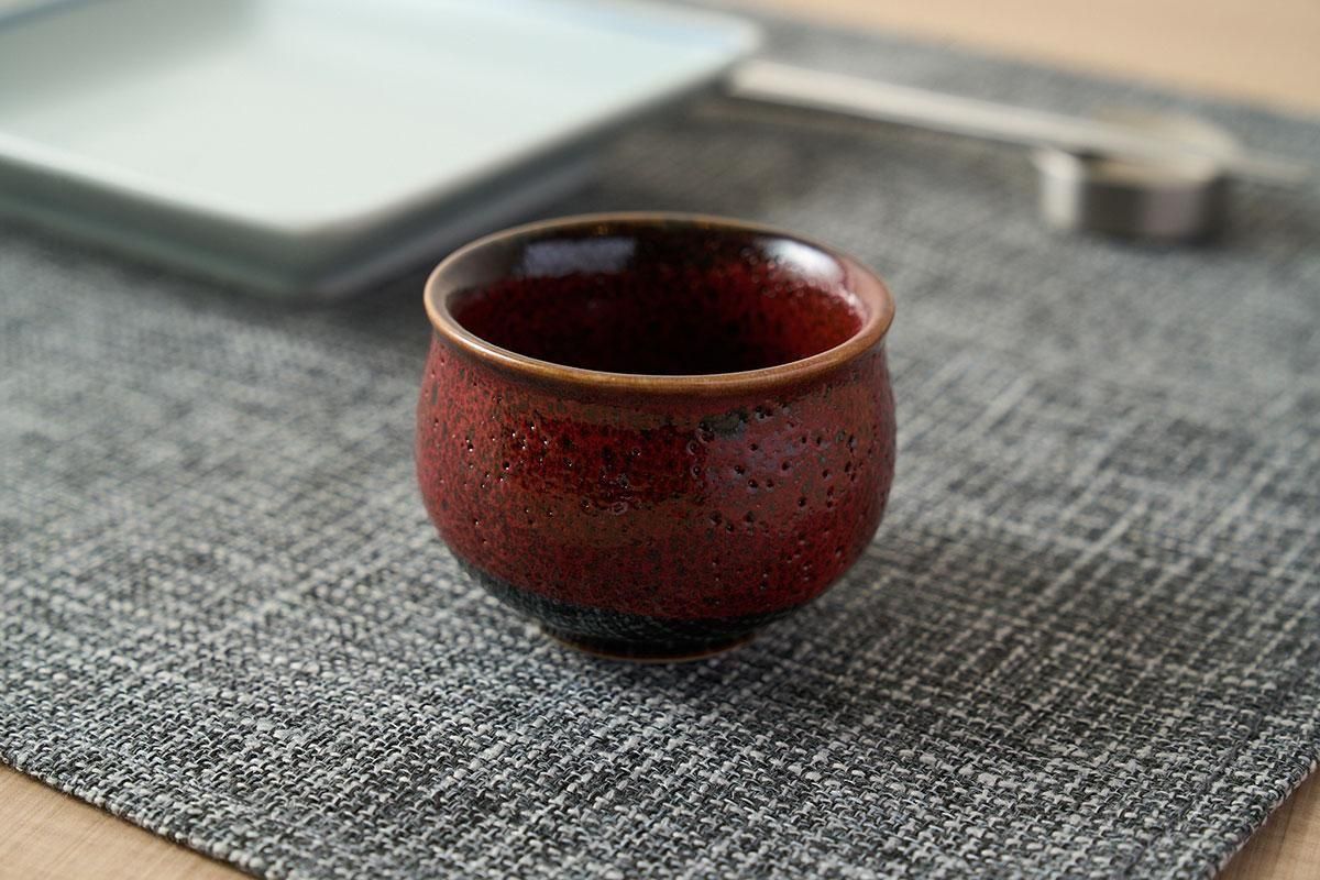 力強い質感と深い朱色が美しい『朱印』シリーズのお猪口。上品なデザインで食卓をモダンに演出し、食洗機・電子レンジ対応で使い勝手も抜群。