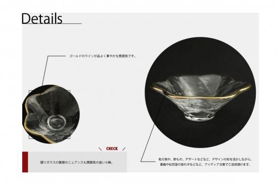 摺りガラスの質感のニュアンスも雰囲気の良い小鉢には、和え物や、酢もの、デザートなどなど、デザインの形を活かしながら、重箱などに入れアイディア次第でご活用頂けます。