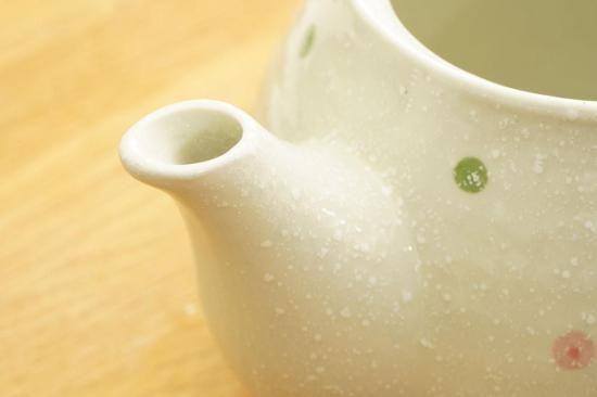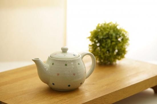 白磁のボディーに、緑、青、ピンクのドット模様が特徴です。