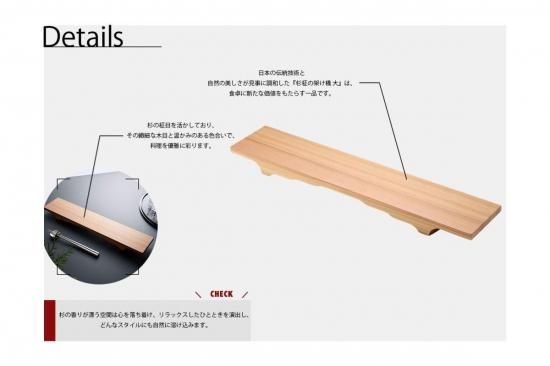 杉の柾目を活かしており、その繊細な木目と温かみのある色合いで、料理を優雅に彩ります。