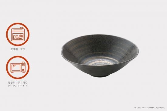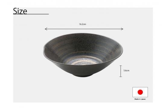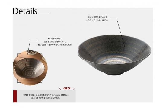 黒い陶器の素地に、金と銀で彩りを巻いており、吹付で表面に光沢があるので高級感も充分。