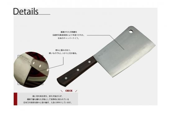 厳選された刃物鋼を伝統的な製造技術により手造りされた、杉本のチャッパーナイフ。