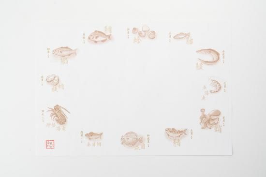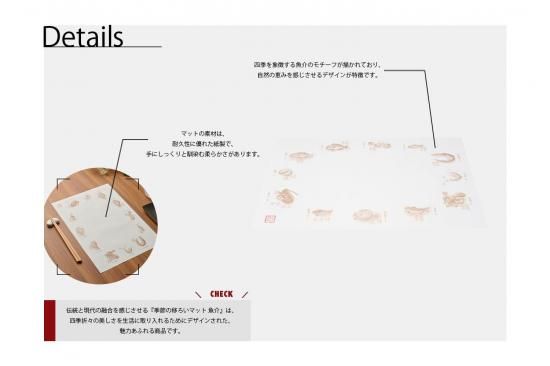 このマットには、四季を象徴する魚介のモチーフが描かれており、自然の恵みを感じさせるデザインが特徴です。