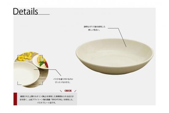 厳選された上質のカオリン(陶土)を使用した清潔感あふれる白さが目を惹く、山加ブライトーン強化磁器『BRIGHTONE』を使用した、パスタプレートです。