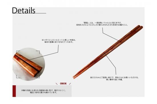 木箸の元祖とも言われる馴染み深い形で、転がりにくく、幅広い世代に愛され続けています。