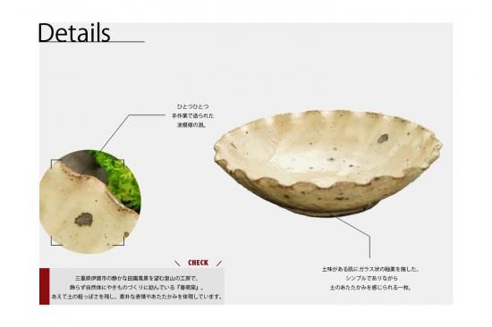 荒く味わいのある伊賀の土に純度の高い精製を施さず、あえて小石や鉄分といった不純物を残すことで、素朴な表情やあたたかみを器に体現しています。