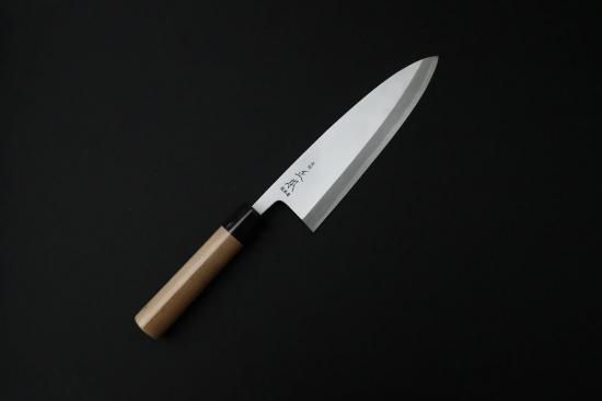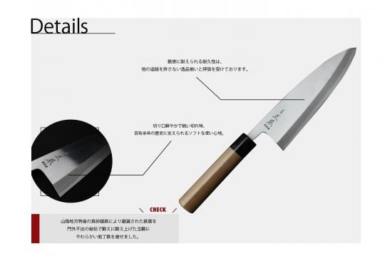 山陰地方特産の真砂蹉跌により厳選された鉄質を門外不出の秘伝で鍛えに鍛え上げた玉鋼にやわらかい庖丁鉄を被せたもので、切り口は鮮やかで鋭い切れ味、百有余年の歴史に支えられるソフトな使い心地、そして酷使に耐えられる耐久性は、他の追随を許さない逸品揃いと評価を受けております。