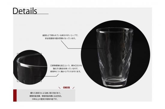 口部物理強化加工という、飲み口だけを強化する製法を使っているので、長期間使っても、使用中につく傷からグラスを守ります。