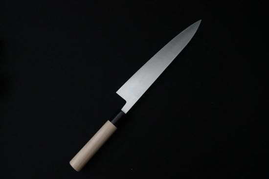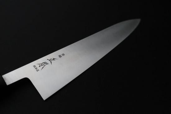 鋭い切れ味の持続で高い評価を得ている本霞玉白鋼シリーズに、和食の調理師の手になじみ易いよう水牛をすげてあります。
