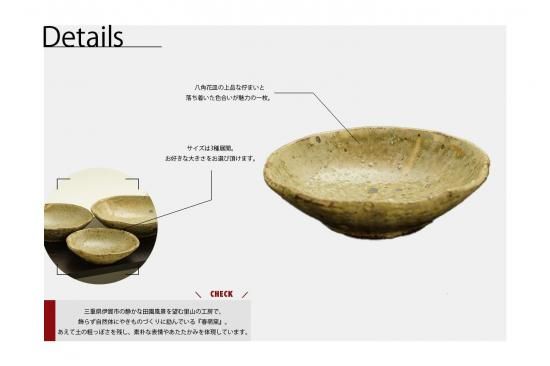荒く味わいのある伊賀の土に純度の高い精製を施さず、あえて小石や鉄分といった不純物を残すことで、素朴な表情やあたたかみを器に体現しています。