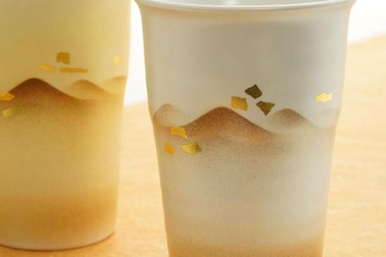 カップ全体に広がる繊細なグラデーションと金箔の輝きが、静かで長い自然の風景を表現しています。