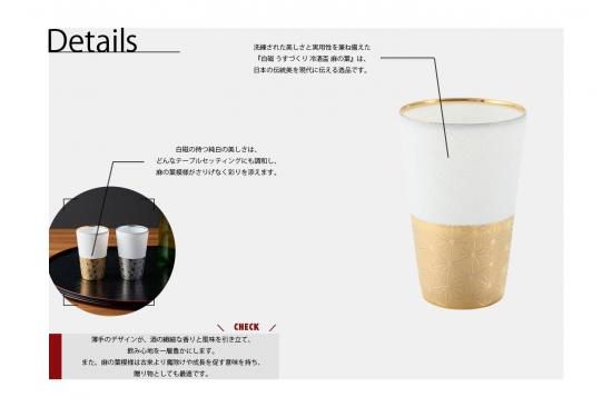 極薄に仕上げられた冷酒盃は、口当たりの良さと手に馴染む軽やかさを体感できます。