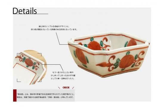 緑と朱のシンプルな赤絵のデザインに、四つ角が隅切になっている特徴のある形状になっています。