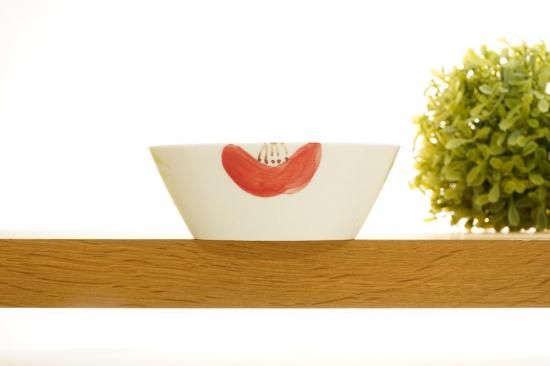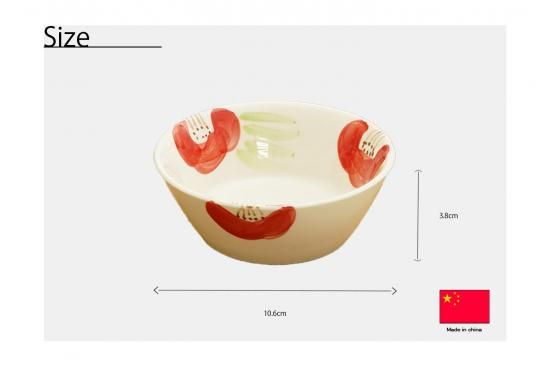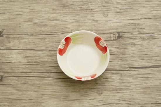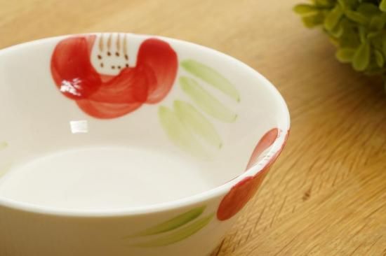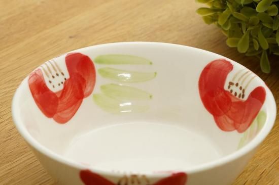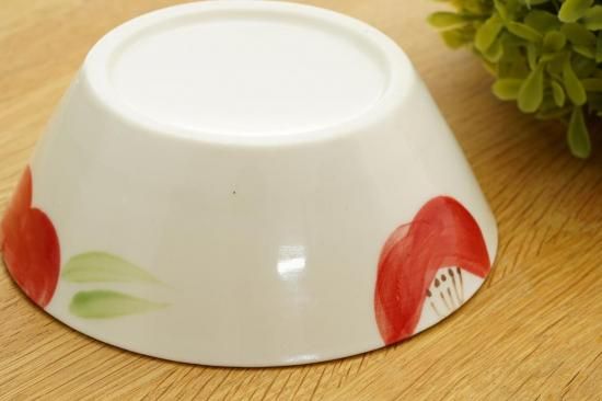 真っ赤な椿の花を絵付けした、ぽってりと厚みのある丸型の小鉢です。