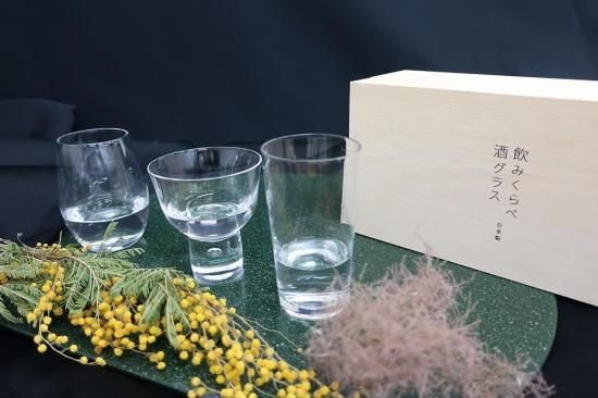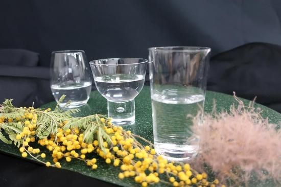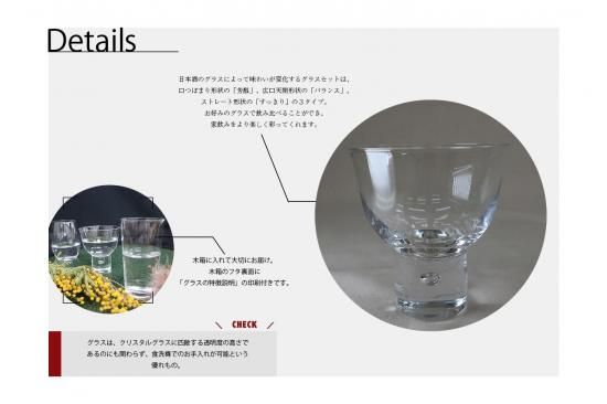 日本酒のグラスによって味わいが変化するグラスセットは、口つぼまり形状の「芳醇」、広口天開形状の「バランス」、ストレート形状の「すっきり」の3タイプ。