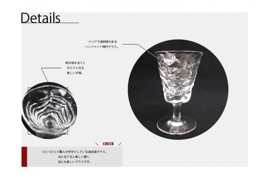 飲料を注ぐとその名の通り、硝子に刻まれた文様がきらりと光る、おしゃれな楕円グラスです。