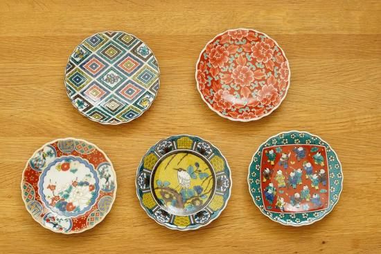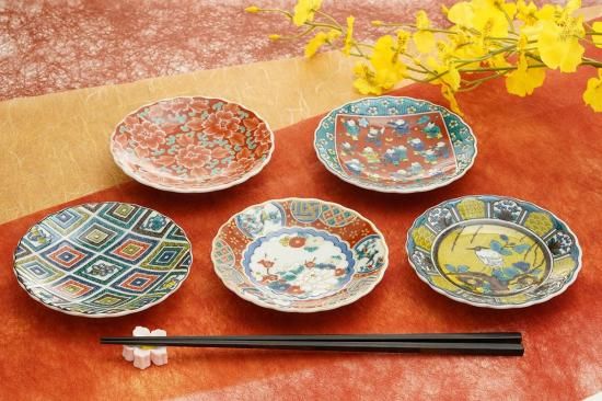 一枚一枚絵柄の違う、目にも鮮やかな菊皿5枚セット。