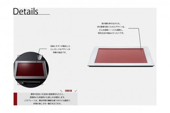 銀雲内銀朱のプレートは、どの角度から見ても美しく、料理を引き立てるアクセントとして優れた存在感を発揮します。