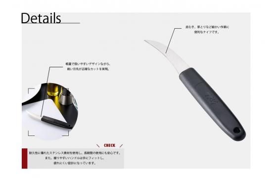 皮むき、芽とりなど細かい作業に便利なナイフです。