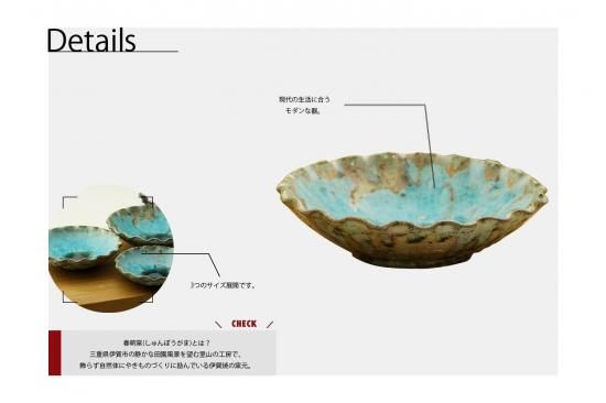 荒く味わいのある伊賀の土に純度の高い精製を施さず、あえて小石や鉄分といった不純物を残すことで、素朴な表情やあたたかみを器に体現しています。
