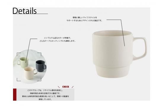 このマグカップは、リサイクル素材を使用し、持続可能な未来を目指す方に最適です。