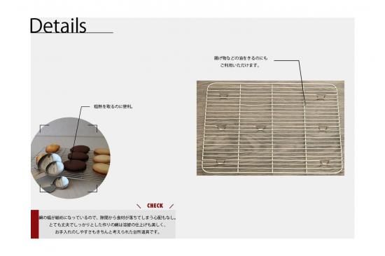 とても丈夫でしっかりとした作りの網は溶接の仕上げも美しく、お手入れのしやすさもきちんと考えられた台所道具です。