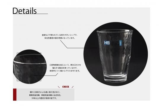 口部物理強化加工という、飲み口だけを強化する製法を使っているので、長期間使っても、使用中につく傷からグラスを守ります。
