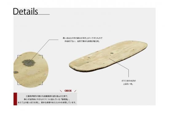 荒く味わいのある伊賀の土に純度の高い精製を施さず、あえて小石や鉄分といった不純物を残すことで、素朴な表情やあたたかみを器に体現しています。