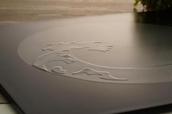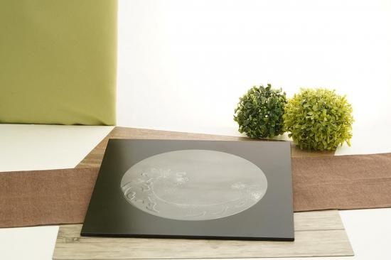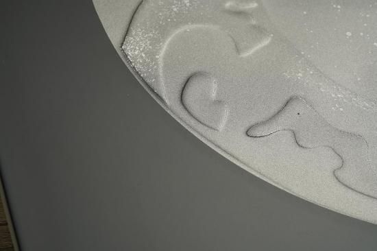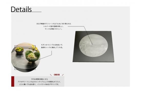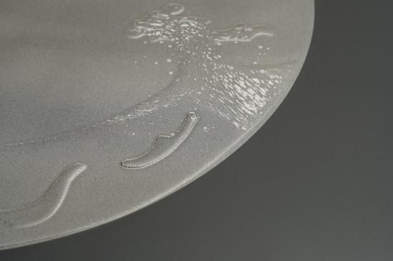 まるで映画のワンシーンのように丸く切り取られたシルバーの波の図柄が美しい、マットな手触りのトレー。