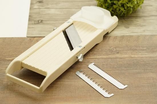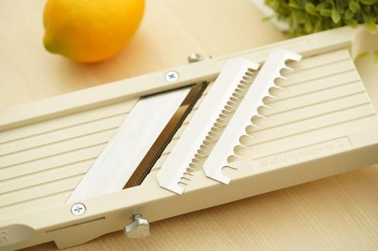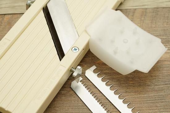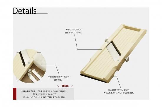 キャベツの千切りや野菜や果物のスライスにお使いいただける「平歯」、刺身のつまなどをスライスするのに便利な「小歯(交換刃)」、きんぴらごぼうを作る時に便利な「中歯(交換刃)」、フライドポテトを作る時や短冊切りには「荒歯(交換刃)」が便利。