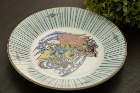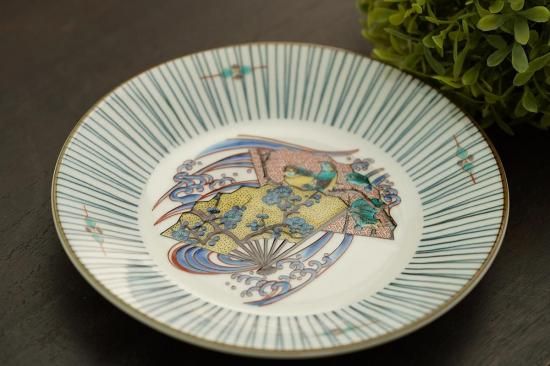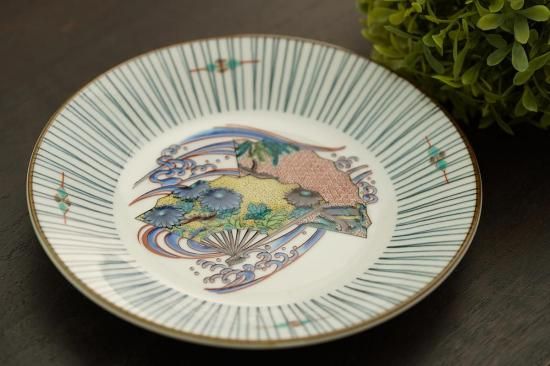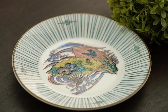 様々な模様の扇が描かれた、美しい九谷焼のお皿です。