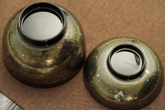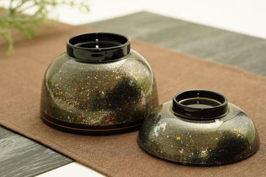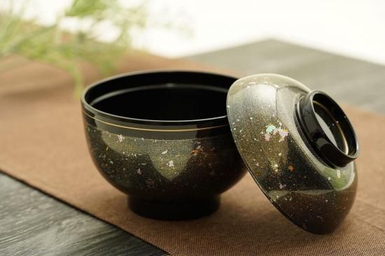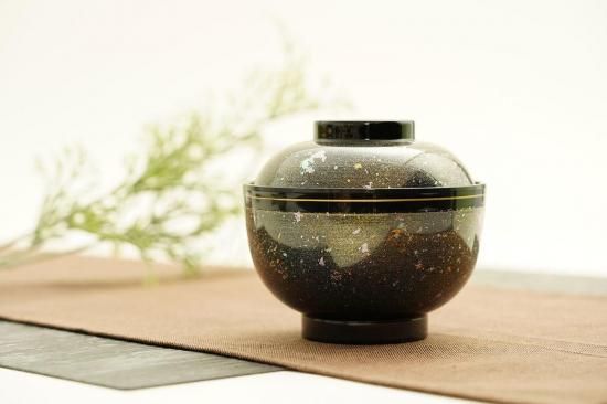 シックな黒色にカラフルな色が散りばめられている、美しいお椀。