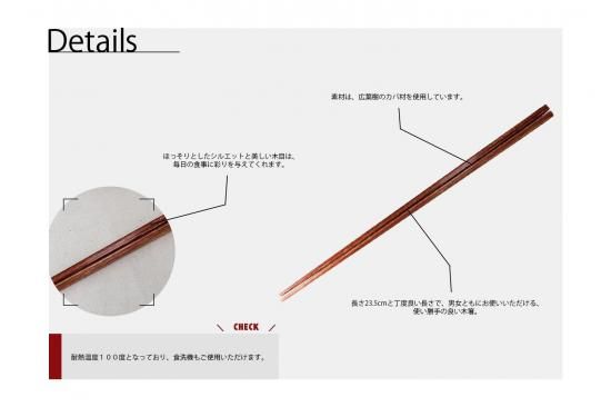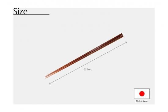 長さ23.5cmと丁度良い長さで、男女ともにお使いいただける、使い勝手の良い木箸。