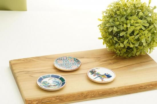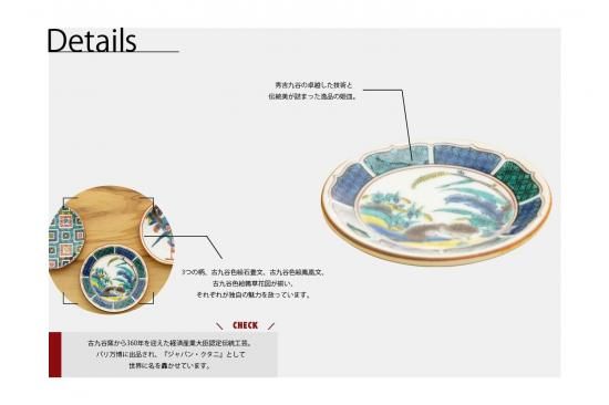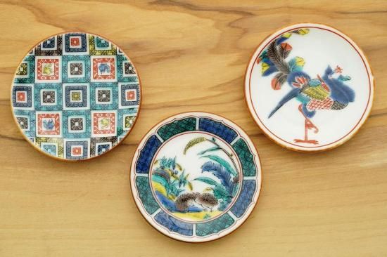 3つの柄、古九谷色絵石畳文、古九谷色絵鳳凰文、古九谷色絵鶉草花図が揃い、それぞれが独自の魅力を放っています。