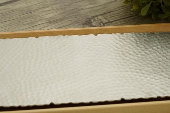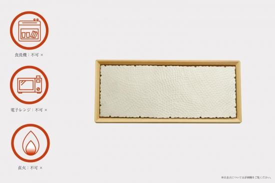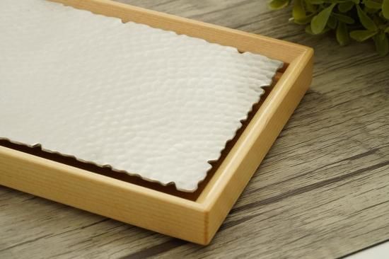 伝統的な槌目模様と現代的なデザインが融合した「ステンレス槌目プレート(マット)長角・小/木枠クリアー」です。