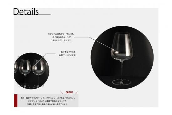 特別なマシン製法でつくられた、薄肉・細脚のクリスタルワイングラスシリーズである『Diverto(ディベルト)』。