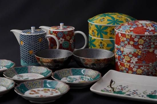 九谷焼の作品の魅力は、五彩(赤・緑・黄・紫・紺青)を基調とした、その独自の色彩が重なりあって生まれる重厚感にあります。