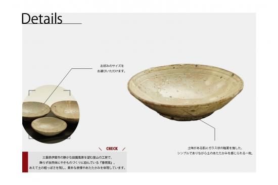 荒く味わいのある伊賀の土に純度の高い精製を施さず、あえて小石や鉄分といった不純物を残すことで、素朴な表情やあたたかみを器に体現しています。
