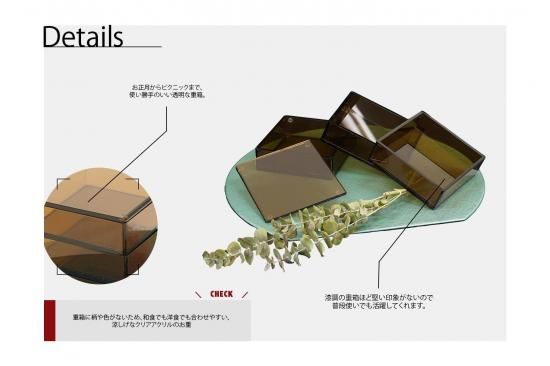 お重と言えば黒や華やかな絵柄のある和風な物が多いかと思いますが、こちらのお重は一風変わったアクリル素材のクリアなお重です。