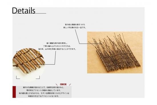 細く繊細な萩の枝を使用し、丁寧に編み上げられたこのすだれは、海の幸、山の幸を多様に演出することができます。
