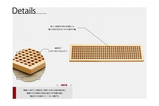 熟練した匠でしか組めない芸術とも言える格子組の技と、厳選された秋田杉の柾目が創りだす至極の逸品『細目(ささめ)格子シリーズ』。