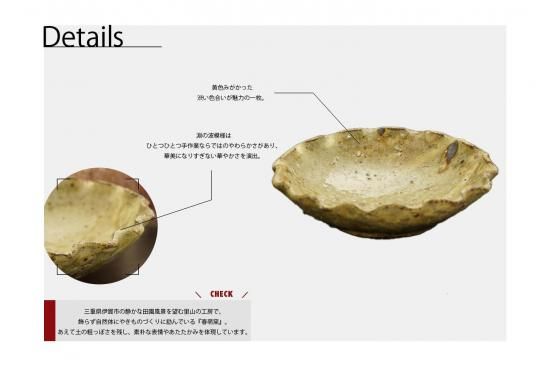荒く味わいのある伊賀の土に純度の高い精製を施さず、あえて小石や鉄分といった不純物を残すことで、素朴な表情やあたたかみを器に体現しています。