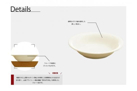 厳選された上質のカオリン(陶土)を使用した清潔感あふれる白さが目を惹く、山加ブライトーン強化磁器『BRIGHTONE』を使用した、フルーツ皿です。
