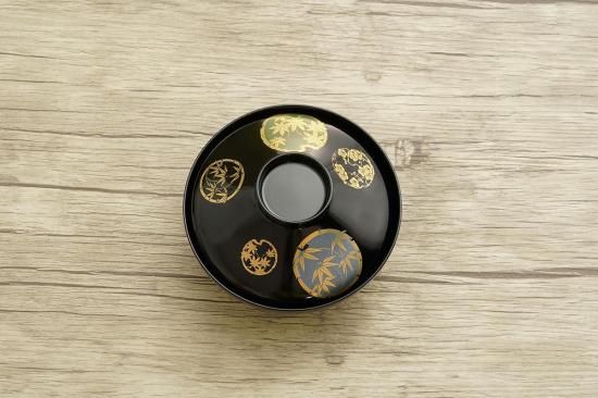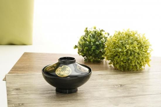 シックな黒地に草木と梅、蘭、竹、菊の4つの花が揃った吉祥文様が跳ねる鞠のように描かれた、渋さの中にも可愛さのある一品の椀。