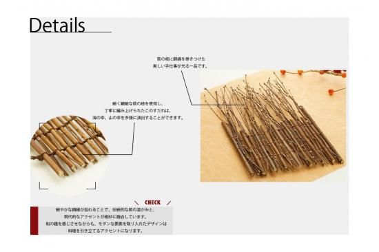 細く繊細な萩の枝を使用し、丁寧に編み上げられたこのすだれは、海の幸、山の幸を多様に演出することができます。