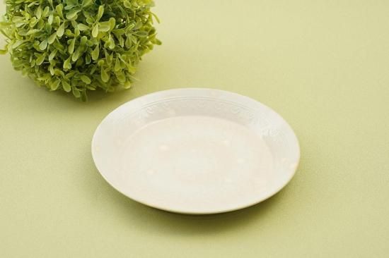 御本手浮彫紋リム付5寸皿は、美しく彫り込まれた細かい模様が特徴の陶器製のお皿です。