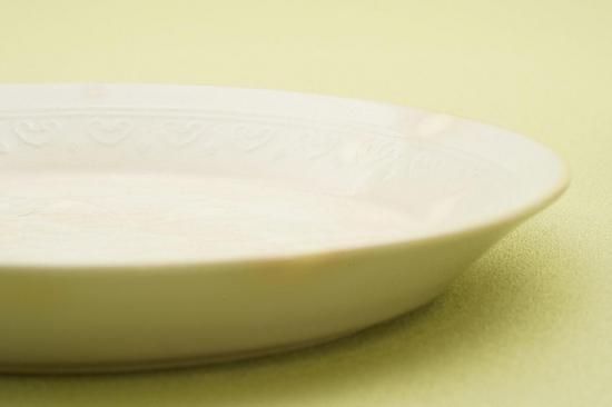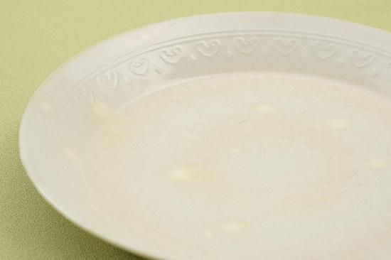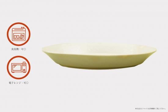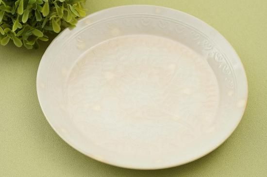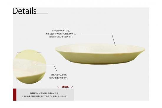 細やかな手仕事によって作り出された浮彫紋が、高級感を醸し出しており、またリム付きのデザインは、料理を盛り付けた際にも安定感があり、見た目にも美しさを加えます。