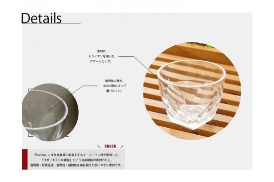 トライタンの材質特徴として、透明感・耐薬品性・強靭性・耐熱性を兼ね備えており、非常に扱いやすくなっています。