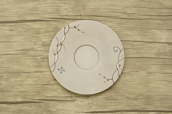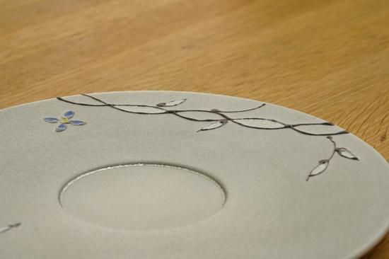 薄めのグレー地に描かれた更紗紋が印象的な、ソーサー。