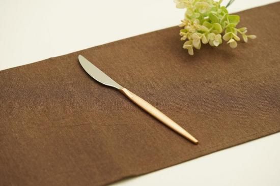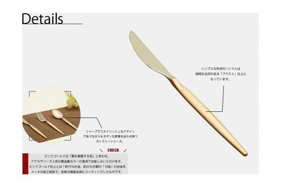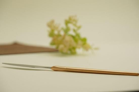 レストランやカフェなどの空間にも適応する美しいフォルムに、ピンクゴールドの輝きを放つカトラリーです。